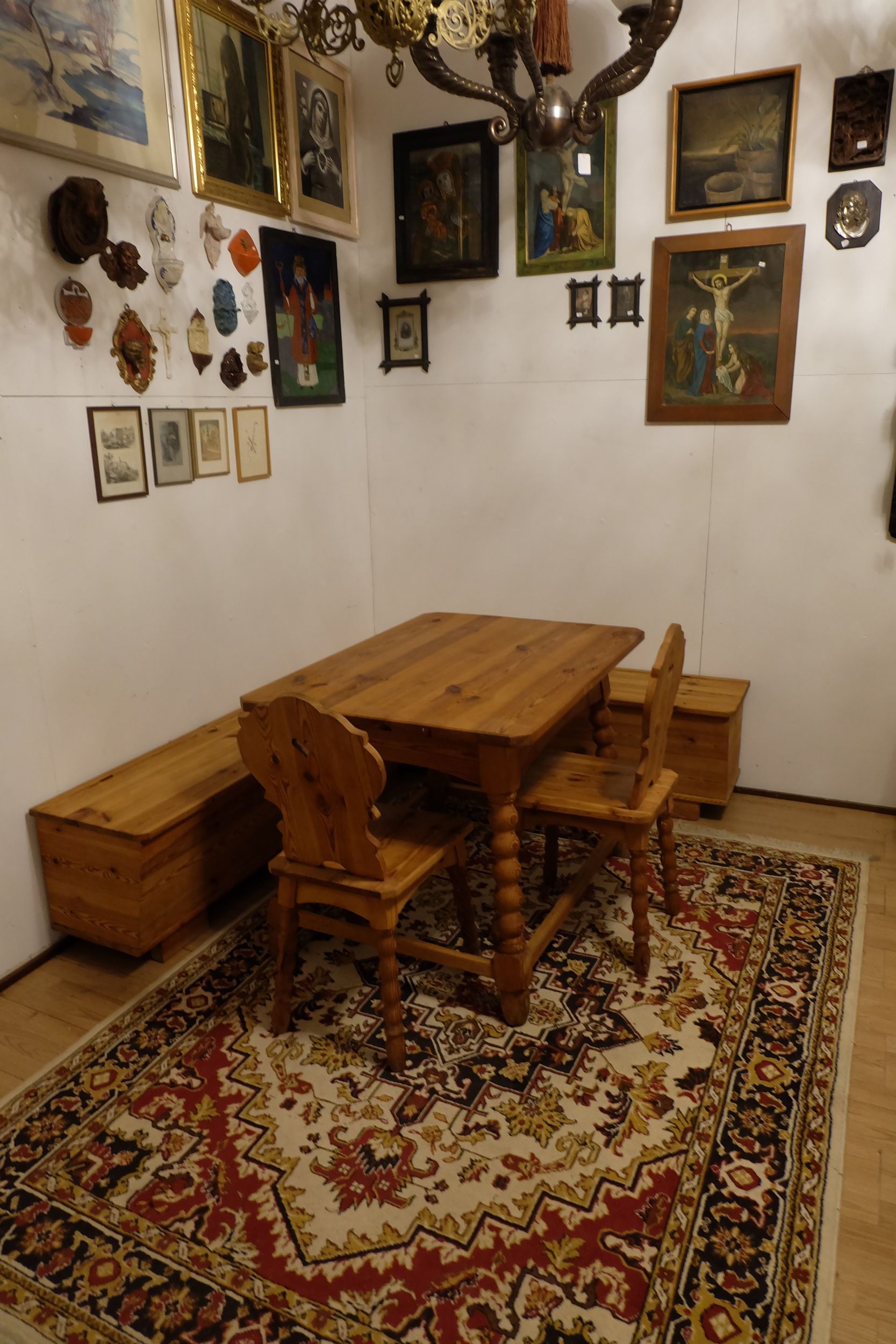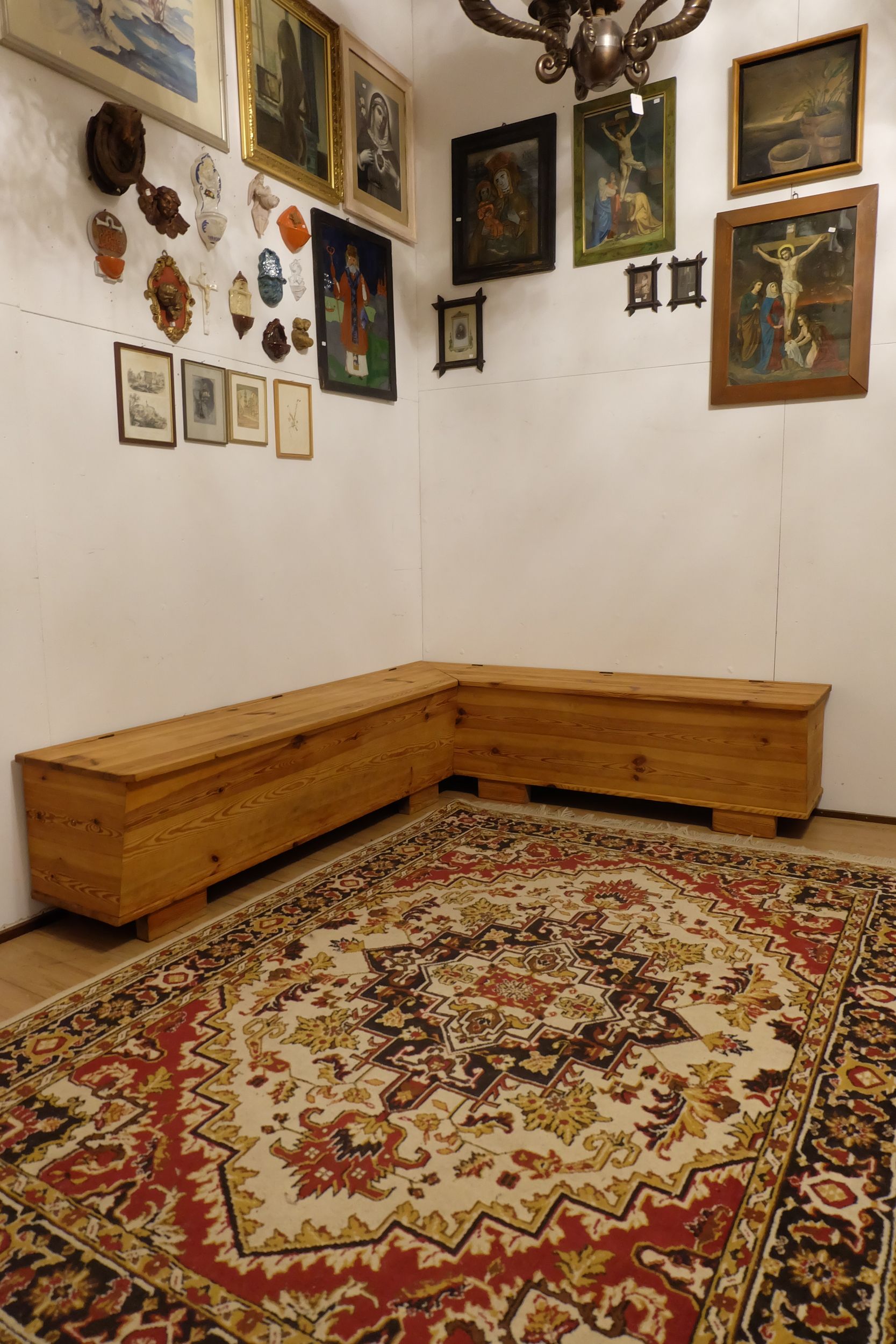 zwei Truhenbänke, zwei Sessel und ein Tisch im Bauernstil